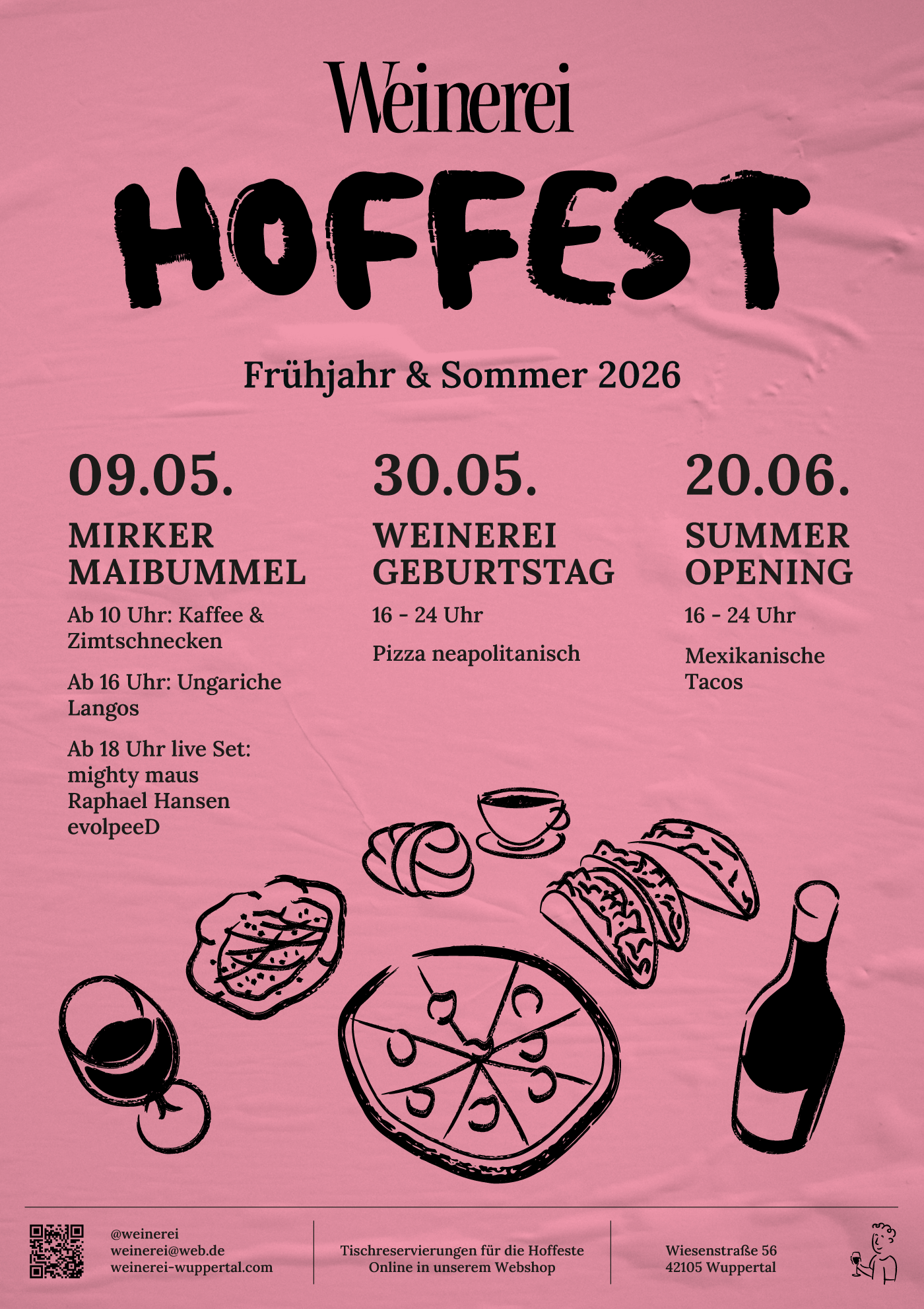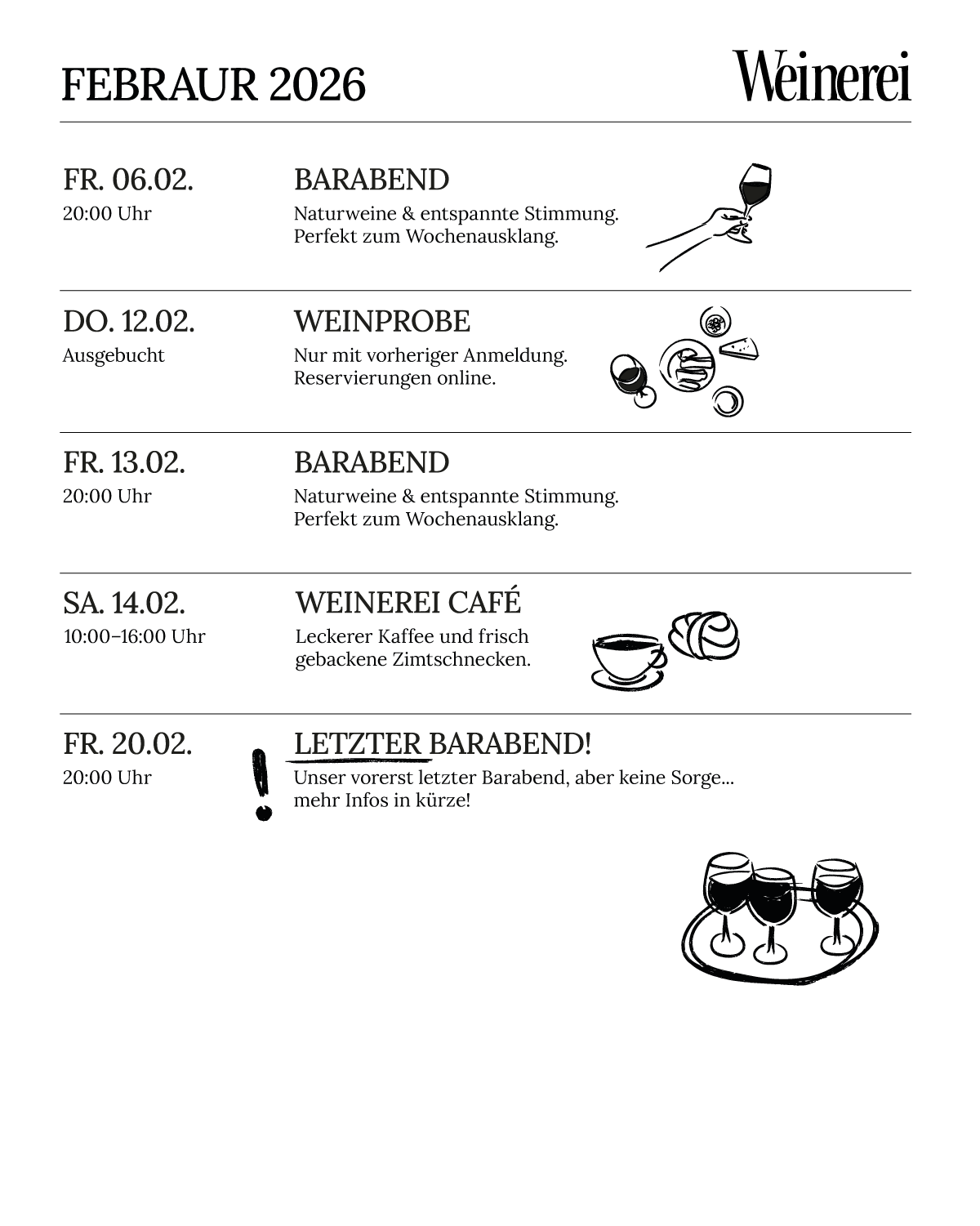 Hier findet ihr alle Infos für den jeweiligen Monat, wie der wöchentliche Barabend am Freitag, unsere Café Termine und weitere Veranstaltungen wie unsere Hoffeste, mit verschiedenen kulinarischen Angeboten und natürlich unseren leckeren Naturweinen.